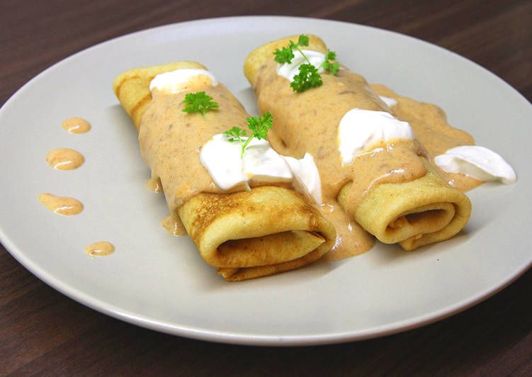 A sütőt előmelegítjük 200 °C-ra (gázsütő: 3. fokozat). A masszával megkenjük a palacsintákat, batyuszerűen felhajtjuk, összetekerjük, és tűzálló tálba sorakoztatjuk őket. Megöntözzük a maradék tejfölös-paprikás mártással, és a sütőben átforrósítjuk (10 perc). Meglocsoljuk a palacsinták tetejét a maradék tejföllel, és petrezselyemmel díszítve azonnal tálaljuk.